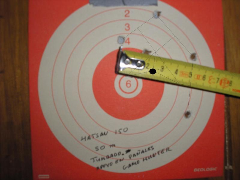 Lo siento, pero como dije, era el culo de una lata, que fue a la basura después de la sesión. Tengo fotos de otras agrupaciones, con otros balines, y esta es mi favorita, con el cálculo del punto teórico donde se apuntaba, pero creo que ya fue mostrada: