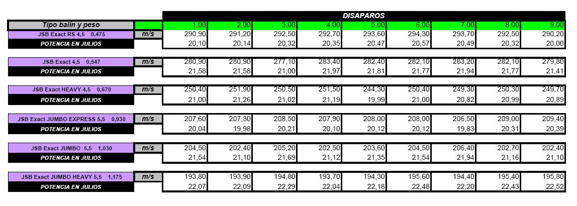 Pues muy constantes y con buena potencia para disfrutar a tope. Yo en 5'5 después de muchos tiros me decanto por los balines de 0'9gramos o menos si puedo, porque consigues trayectorias más tensas. Los Jumbo heavy van fenomenal, pero para calcular la caída es más complejo a partir de los 50mts.