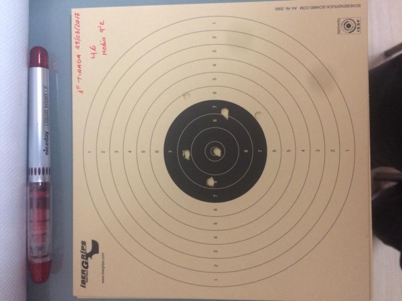 Ya sé que no son ninguna maravilla, pero poquito a poquito y entrenando haremos mejores agrupaciones, la pistola está de serie sin ninguna modificación porque no tengo ni idea y no me atrevo a tocarla para estropearla.