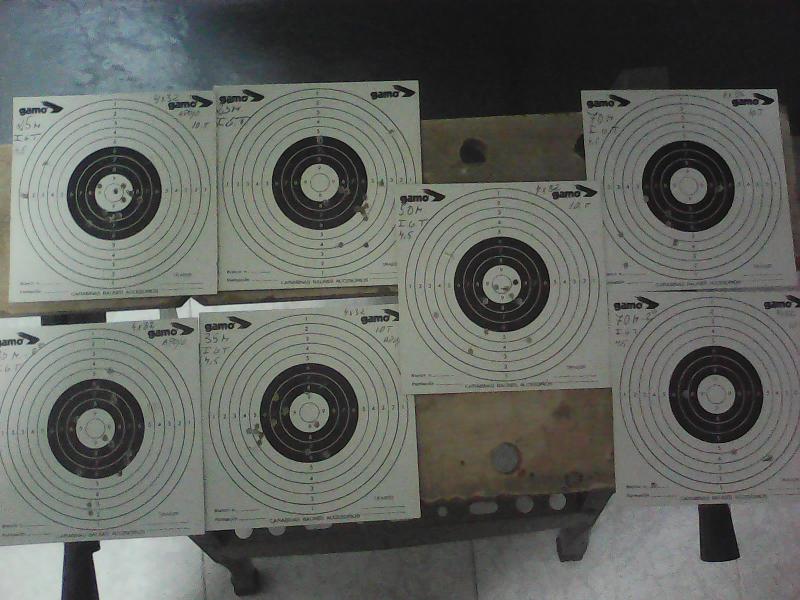 Para ser la primera toma de contacto me doy por satisfecho,aunque la distancia corta en donde me la juego, véase la de 50 m y cinco tiros en una moneda 1 euro (comprobado).Curiosa esta de 50m,pues a los cinco tiros,hice un descanso,con lo que seguro está ahí la dispersión y luego el agrupamiento.