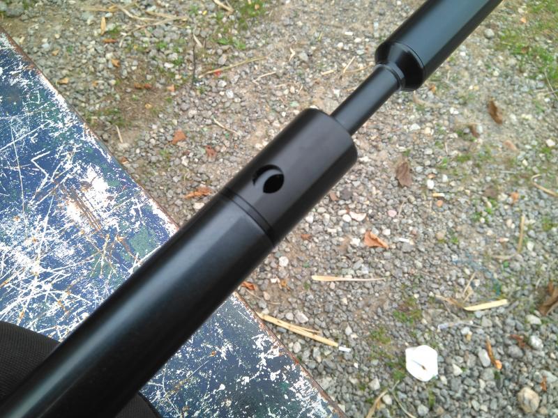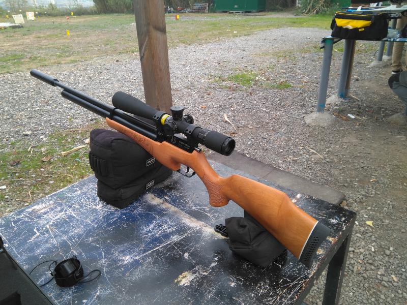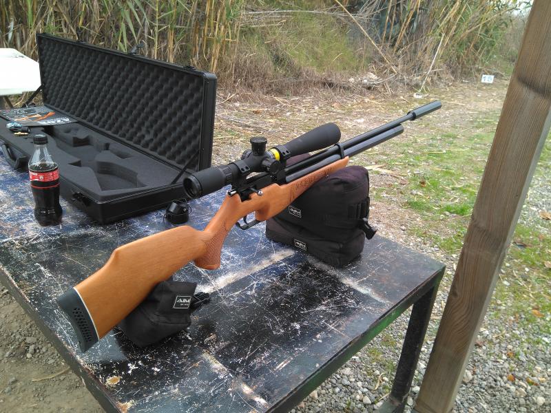 Esta carabina es de calibre 5,5mm, la cargamos a 200bar, la ponemos en los sacos, le ponemos el silenciador, llenamos el cargador y empezamos a disparar para centrarla, al escuchar el ruido (mejor dicho la ausencia de ruido), lo primero que pensamos es que esta muy por debajo de 24j, incluso alguno de los curiosos alli presentes se aventuraba a decir que no llegaba ni a 8j, le metemos el croni y sorpresa grande, 24,2-24,5j, la carabina es tan sorprendentemente silenciosa que da la impresion de que estes disparando sin fuerza, mis carabinas match de 10m a 7j hacen mas ruido, incluso si le quitamos el silenciador y disparamos sin el, se nota igual de silenciosa que otras carabinas a 24j y con silenciador presentes en la linea de tiro ese dia.