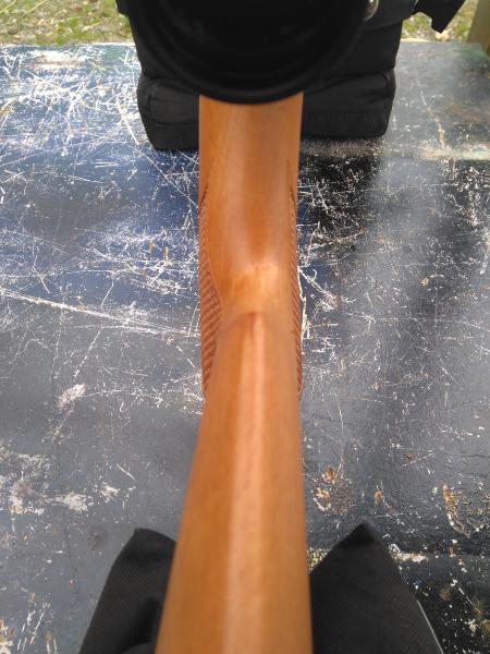 Los anodizados perfectos, la culata espectacular, rara pero espectacular, una madera muy bonita acabada al aceite con unos grabados por laser que quedan preciosos, a mi personalmente me gustan mas los guardamanos mas o menos rectos, pero ahora la moda es hacerlos asi curvos, no me quejo ya que eso reduce la cantidad de madera por delante y en un arma tan larga favorece el equilibrio de masas. Cuando digo que es una culata rara debo hacer mencion especial al pistolete, la culata es evidentemente de diestro ya que lleva carrillera a la izquierda, pero el pistolete no es neutro, tiene una ligera desviacion que resulta mas comodo de agarrar por los zurdos, estoy rizando mucho el rizo con esta apreciacion ya que tambien es comodo para los diestros, pero es ligeramente mas comodo para los zurdos. Creo que es una culata de preserie (cosas de las ansias por ver y probar el producto), de todas formas yo creo que hoy en dia para culatas tipo montecarlo, lo suyo es hacerlas completamente ambidiestras, con pistolet neutro y carrillera a ambos lados.