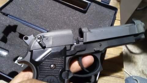 Es la clásica Beretta 92, pero le faltan, como a todas las replicas, pequeños detalles de realismo, no hay uña extractora, pieza de bloqueo, rebaje de la corredera a la altura de la recamara, hace mucha chepa la corredera con el cañón......y cosas de esas.