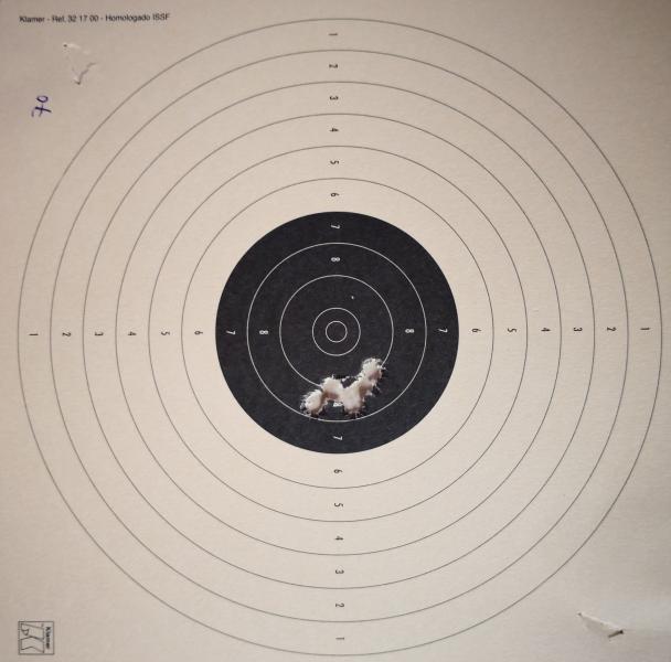 Edgun R5M long 6.35, un cargador completo en ese grupo, o lo que es lo mismo 9 disparos, distacia 60m. Malas condiciones de luz, a buen seguro, se podria mejorar el grupo.