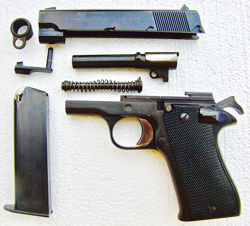Corredera con punto y mira, aguja percutora, uña extractora y muelles de las mismas.