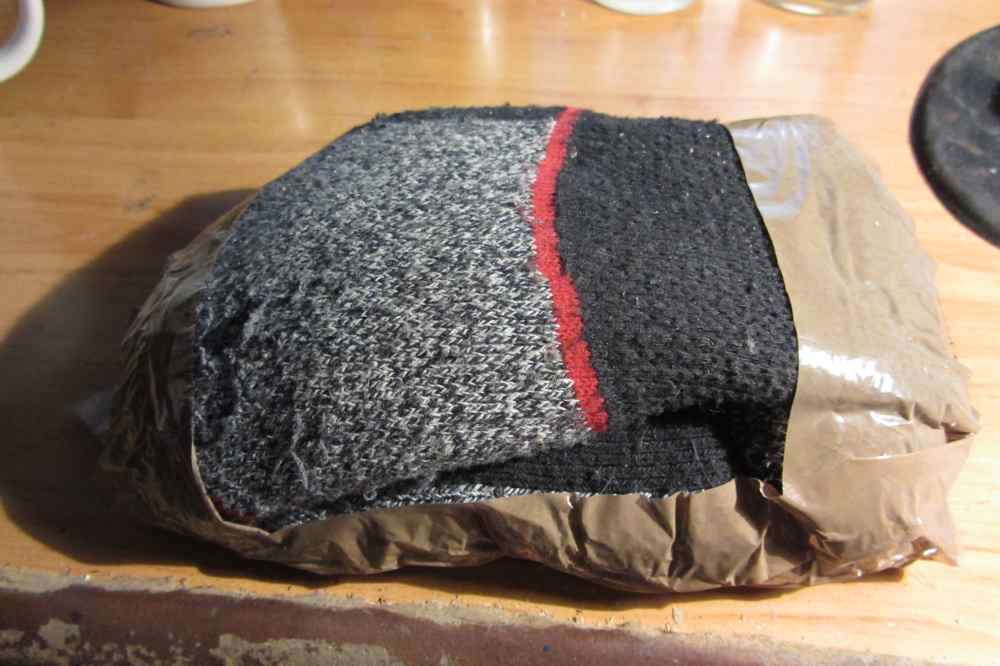 Lo llenas (sin apretar mucho la arena) a la mitad y lo doblas sobre sí mismo. La cinta de embalar es para que no se abra