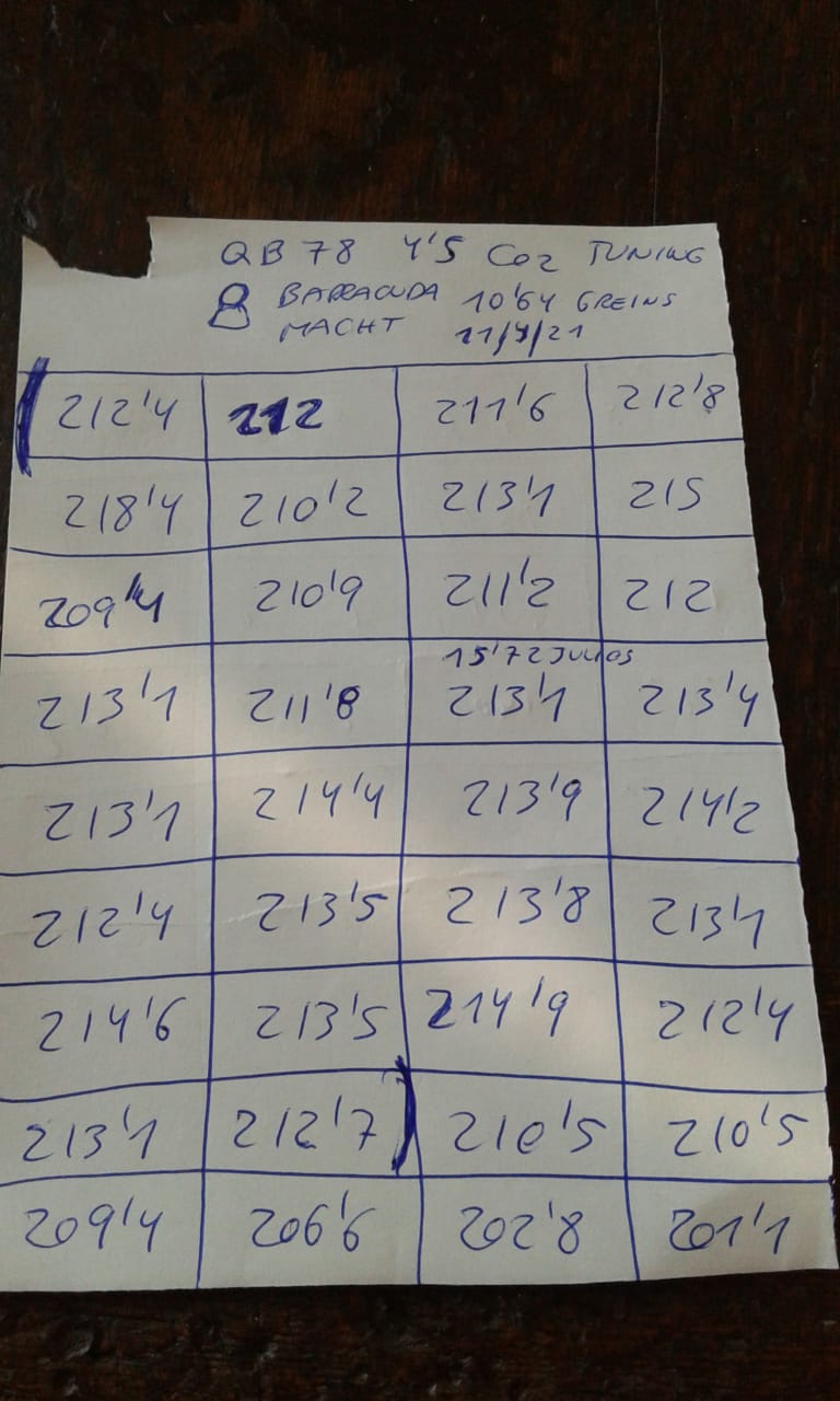 Os dejo el los resultados tras tuner la qb78 de luxe en 4,5, perfecto trabajo de J. Serrano, que la ha dejado muy fina a mas de 15 j con baracuda match. Sorprendente como va la "china" low cost y el visor tasco x4 AO que le he montado, de pequeño tamaño pero que funciona perfecto tanto en claridad de lente como en el afinado de cliks por un costo de 75 euros.