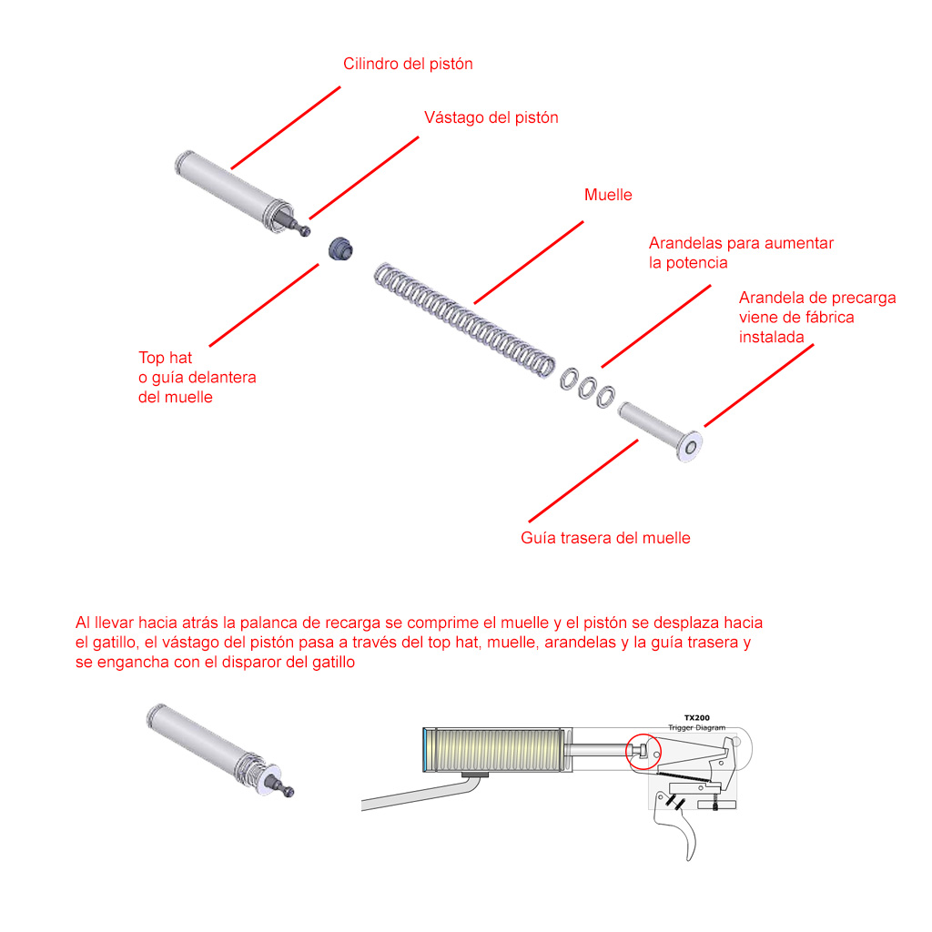 Lo que me pasaba es que estaba equivocando las arandelas. La que viene instalada es la que hace tope con el cilindro del pistón y las que yo quiero añadir tienen que ser del mismo diámetro interno pero de un diámetro externo más pequeño, que no supere el diámetro del muelle. Yo estaba poniendo dos arandelas de precarga juntas, la que me venía instalada y la que venía en el kit de mantenimiento y claro topaba el cilindro del pistón y no llegaba a engancharse con el disparador.