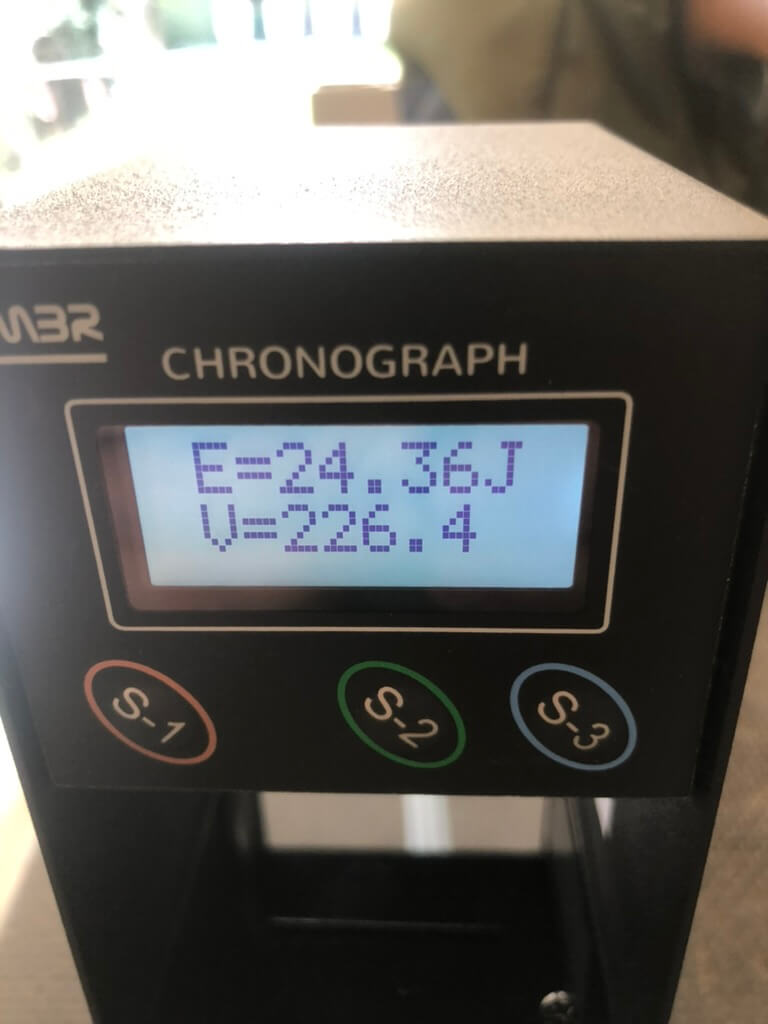 Primero estuve a 25 metros, corrigiendo con las torretas la incidencia del viento y asegurando el tiro sin caída a esa distancia. Luego, pasé el chrony, 24,3j. Después usé la calculadora balística para conocer la caída del balín y corregir subiendo el arma los mil dots necesarios (sin usar torretas).