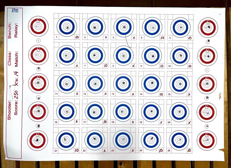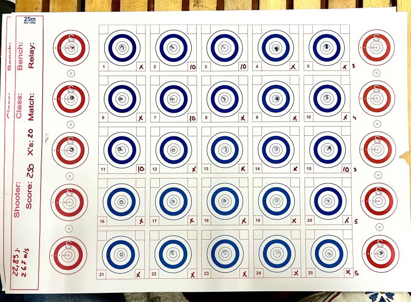 Están bastante bien, aunque sin viento esperaba algo más de X, si que veo que haces pocos tiros en las de prueba, a la mia le gusta mucho que haga 5-7 tiros en la de prueba antes de empezar las dianas buenas, y se nota bastante la diferencia de precisión, por si quieres probarlo