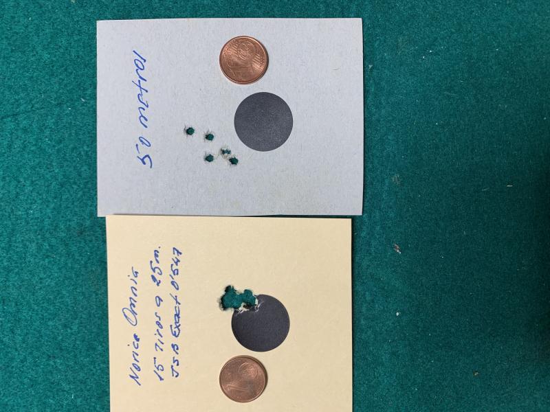 Retornando algo a la normalidad, subo unas foto de dos agrupaciones realizadas hoy con la carabina Norica Omnia, una a 25 metros y la otra a 50, esta última con JSB Heavy.
