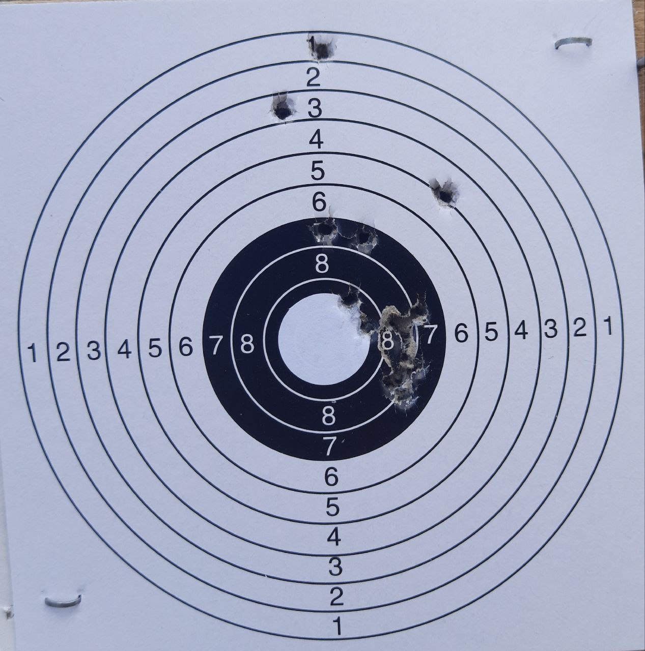 farmergun escribió:Otra diana con la Daisy 901, visor 1-4x26 a 4 aumentos, a 7 metros y 5 bombeos. De pie. 10 tiros. El punto blanco mide 2 centímetros.