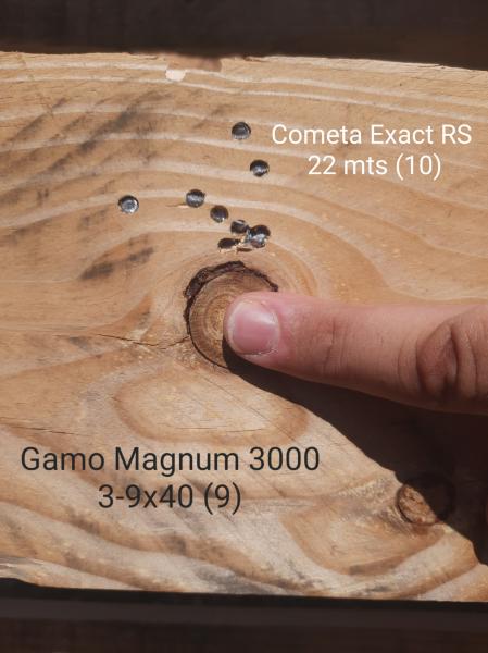 La carabina es una Cometa 220 Galaxy Compact que me ha encantado, el visor un Gamo 4x32 AO (humilde pero resultón) y los balines unos humildes Gamo Match. La distancia unos 10-12 metros.