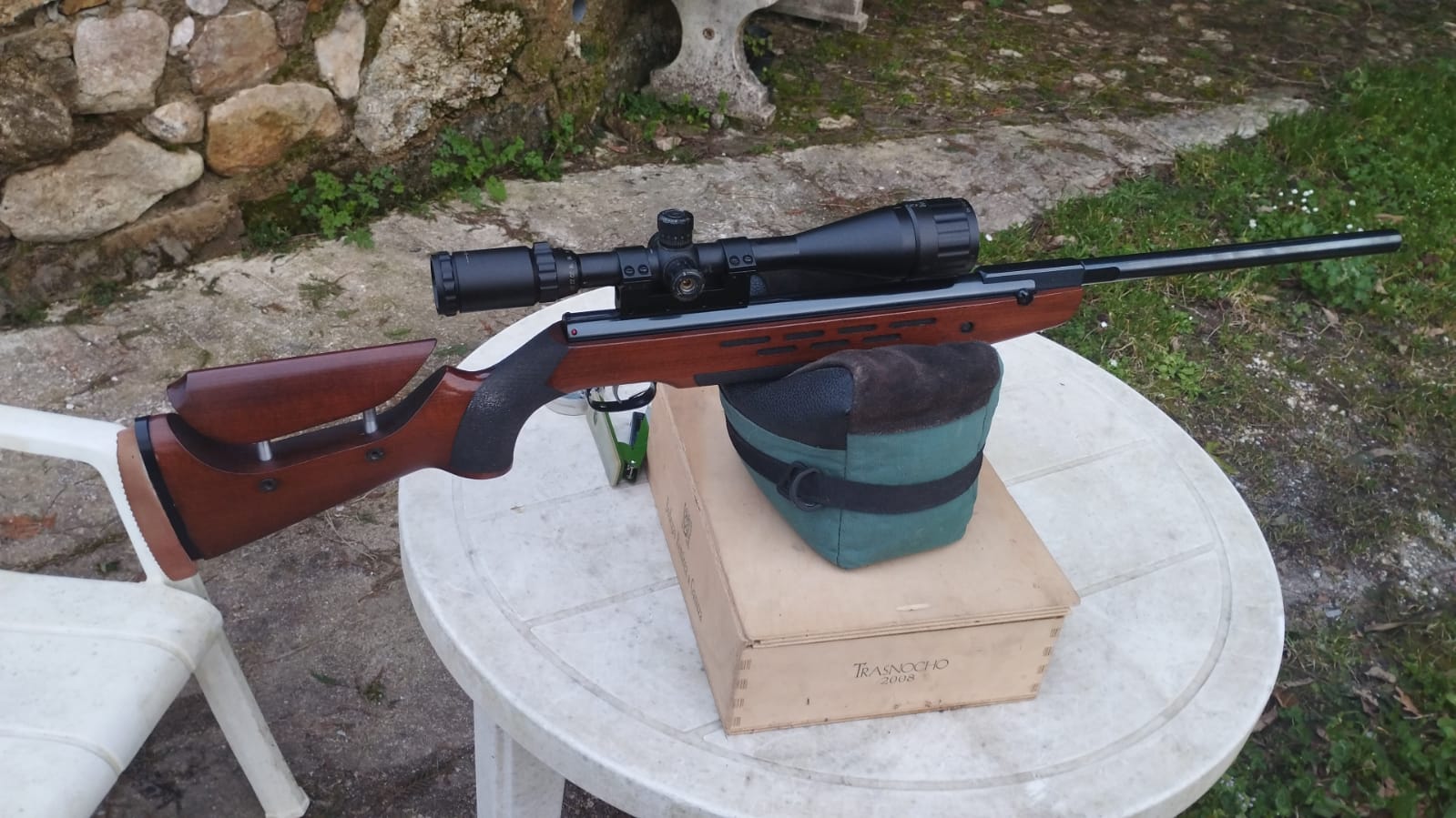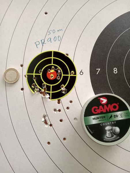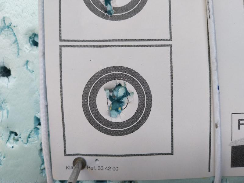 Sin calentar ni dianas previas, la primera que hice a esa distancia. Antes habia pegado 4 tiros a 50m para calentar el muelle y comprobar el cero.