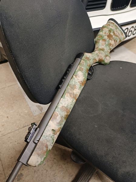 Opté por probar algo nuevo, y me atreví a profanar la culata de madera haciendo esta herejía de camuflaje casero. Para el acabado del metal, más de lo mismo. Pasé de pavonados en frío y nuevamente se me ocurrió que hacerle un cerakote sería una buena idea. El problema es que eso cuesta una pasta, así que pillé pintura de forja y, después de todo, y rematando con lana de acero muy suave, ha quedado un acabado bastante decente por poco más de 10 euros.