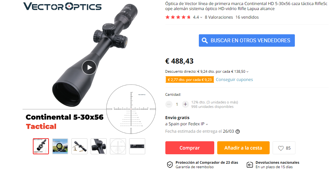 Otra, también se que una gran mayoría, de los visores de Aliexpress, solo se conocen las gamas bajas y extra-bajas, en una palabra, las baratas, pues tengo claro, que también hay gamas altas, con tubos mecanizados de una pieza maciza, no martillados, y lentes de las buenas, e incluso de importación, pero claro, esos ya cuestan una pasta, y por aquí, en una armería tampoco los vas a ver, porque se pondrían a precios de visores de primera división, a 1.000 pavos, y nadie los compraría, teniendo cinco o seis marcas premium por ese mismo precio a elegir, como el de la foto, fabricado con lentes alemanas de las buenas, las mismitas que usa un visor Zeiss, y ahora, entre un Hawke de 500 pavos, y el chino, pues, sinceramente, y con la mano en el corazón, me quedo con el chino..........