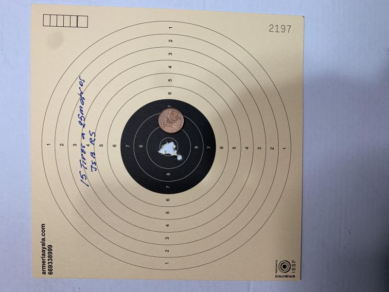 Esto va mejorando, de momento los balines que mejor me van son los RS de JSB, a última hora que hace menos aire, he hecho una tirada de 15 balines a 25 metros, luego más bien para ver que pasaba, he pegado cinco tiros a 50 metros y he quedado sorprendido del “rendimiento” que dan solamente 7,5 julios.