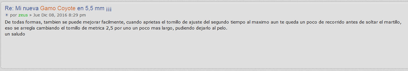 Hola, buceando por los mundos de internet encontre la solución al tema del gatillo, os dejo el pantallazo de como se hace. Simplemente se sustituye el tornilo metrica 2,5 del segundo tiempo por uno un poco mas largo y ahora es una gozada como ha quedado, al pelo y con tan solo 650 gramos de peso de media, sin duda ayudara a la precision tirando. Tal como salio de la caja estaba en torno a 950 gramos.
