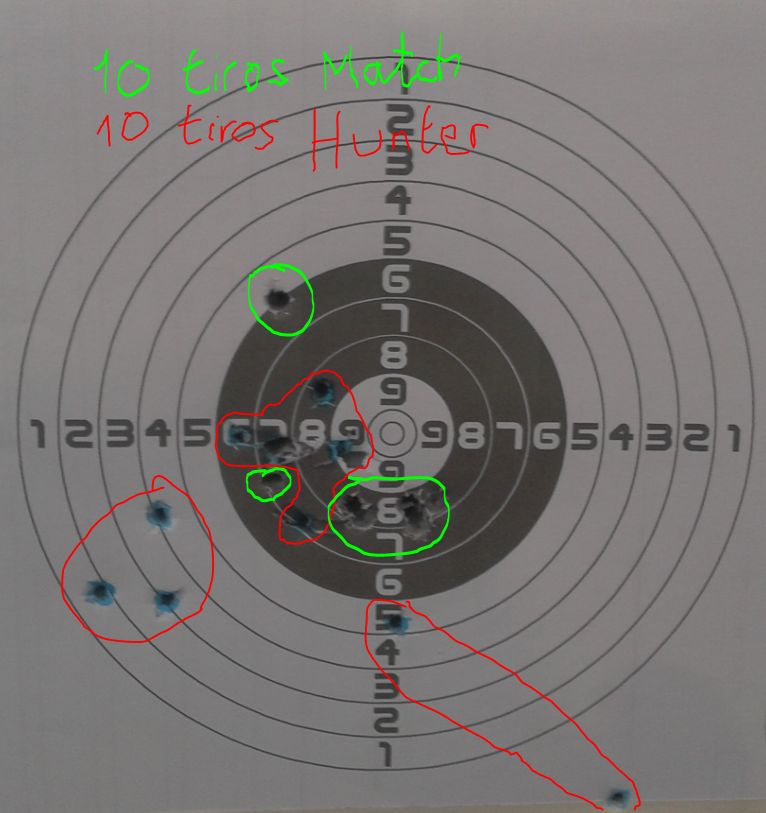 Os pongo como ejemplo una diana con 20 tiros, 10 de hunter y 10 de match. Como dije, fueron a 25 metros, apoyando el guardamanos sobre un palet de sacos, yo en pie. ¿Qué os parece?