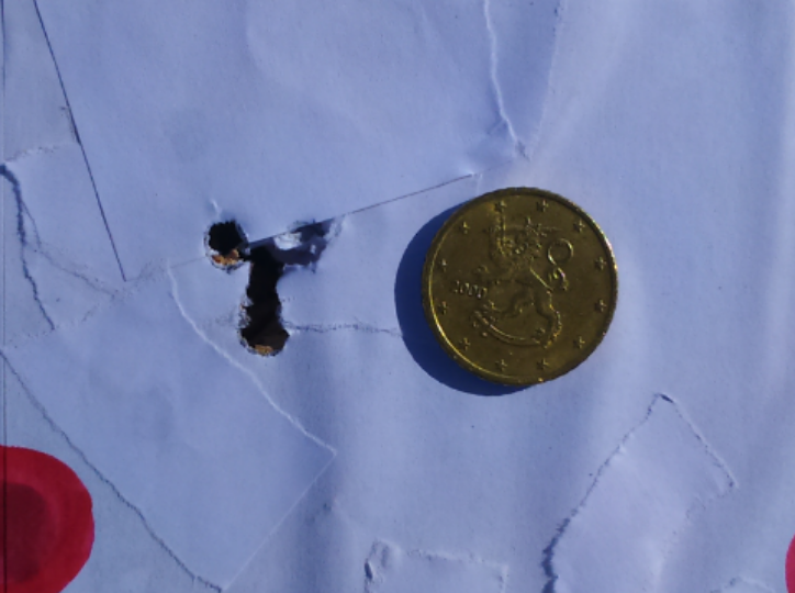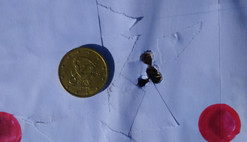 La munición ya tenía referencias de otra unidad que he tenido, y a no muy altas potencias el jsb jumbo es el más aconsejable, a energías full los heavy, falta de probar los exprés, aunque con estos resultados a 16 grins casi ni me molesto más, el indio da de sí lo justo, el mérito es del arma, con un cañón de 250mm en una carabina que plegada mide 35cms,esta precisión me sorprende, además el arma está tirando a muy buena energía muy por debajo del máximo que llegaría a rendir.