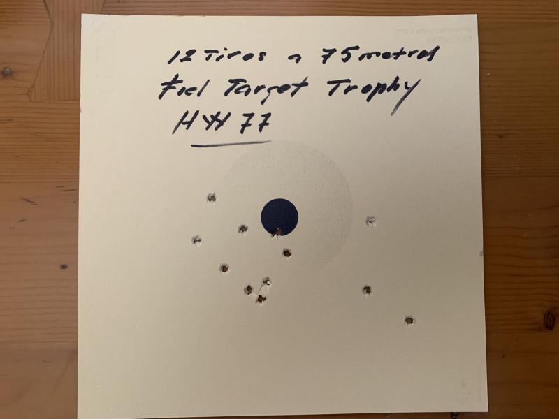 Subo diana realizada hoy, con carabina Weihrauch HW77, a la distancia de 75 metros, con balines HN FTT, calibre 4,5 a una potencia de 16,5 julios. El parche de referencia tiene 16 m/m.
