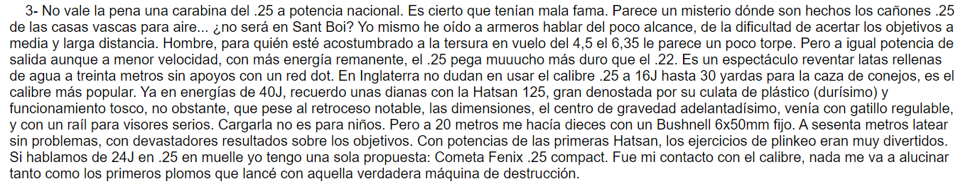 La HW77 la he visto un arma contundente (y de peso, que como lado bueno sin duda sirve para estabilizar), pero no sé si sería que el muelle ya estaba algo tocado para el 6,35 o que, que no me ha parecido tan espectacular, y eso que había leído muy buenos comentarios aquí al respecto. Me salían los balines a unos 160 m/s y apreciaba un poco las estelas incluso.