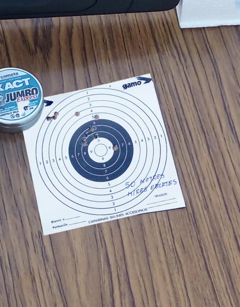 Sin embargo, me echa hacia atrás todo el proceso de montar y desmontar el alza o la mira óptica cada vez que quiera pasar de pistola a carabina o viceversa, así que he decidido dejarla sólo como pistola aún a riesgo de desperdiciar su magnífico cañón largo, y me he comprado una carabina CFX IGT también en 5,5 de la tan denostada marca Gamo. No voy a entrar en más detalles sobre ella pues no es éste el foro adecuado, pero me veo obligado a decir que a 50 metros con miras abiertas y al igual que con la Ares, con los codos apoyados en la mesa, éste fué el resultado: