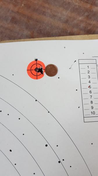Buenas noches, suelo tirar a 50 metros con una Cometa Orión SH Long regulada calibre 5.5, primero a dianas de 3 pulgadas reactivas, y desde hace un par de semanas a dianas de 1 pulgada no reactivas que no son muy fáciles de ver los impactos en ellas, por experiencia os digo que lo mejor que me va es un bípode no muy malo y un buen saco detrás, he probado saco delante y saquito detrás, y me volvía loco, no sabía como apoyar ni inmovilizar la carabina, también he probado un saco de libro, 3/4 de lo mismo, hace unos 10 días se me ocurrió poner delante un bípode barato y bién montado, y detrás el saco delantero que usé al principio, mano de santo. Tan sorprendido que la sensación raya la incredulidad. Inserto unas fotos de como me va ese sistema, la primera foto con dos líneas de dianas separadas con una raya, la linea superior es del día 28 agosto, y la línea inferior del día siguiente, la segunda foto muestra uns agrupación de 5 tiros (la tercera diana de la línea de arriba) junto a una moneda de 1 céntimo.