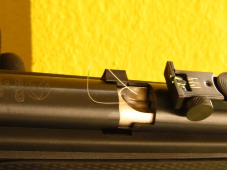 Pasamos el hilo de pescar ( a ser posible del tipo trenzado que es más fuerte para evitar que se rompa) doblado por la mitad, Los dos extremos quedan en el lado de la salida del cañón.............