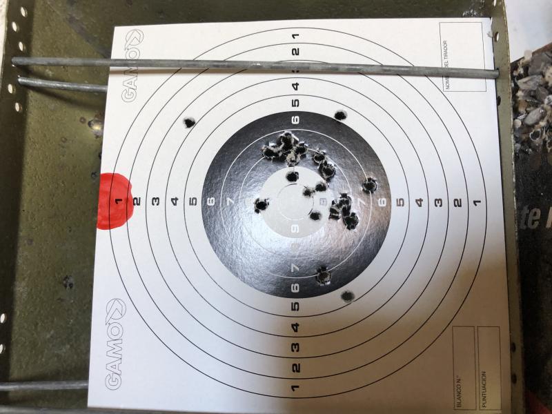 Edito: Esos problema de gatillo se han ido dando cada vez con mayor frecuencia, hasta tal punto que es casi diario en 20 disparos que sucedan 4 o 5 veces. No es tema de engrase, Ballistol a tope y la cosa sigue igual o peor. Veréis un punto rojo arriba de la diana, es el punto que tomo como referencia para disparar y que el disparo vaya al centro, se trata de una forma muy difícil de disparar porque a penas puedes tener la referencia de la diana. Se dispara por intuición