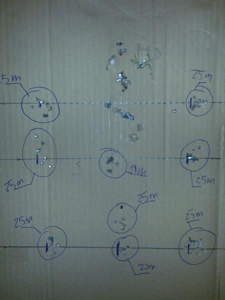 Esto ya va cogiendo otro color, con el visor centrado a la diana que puse el otro día a 11m. pues no lo toque y en un cartón grande dibuje unas lineas horizontales de referencia y un punto en vertical y empezé a disparar, estos son los resultados. Fuí jugando con los "dots", probé primero a 20m. y viendo los resultados empezé a 25 y la verdad que ha ido muy bien. Lo que pasa es que en el banco si aprieto un poco más de la cuenta la carabina o según como la coja salta de una manera u otra, girandose algunas veces y se van los disparos.