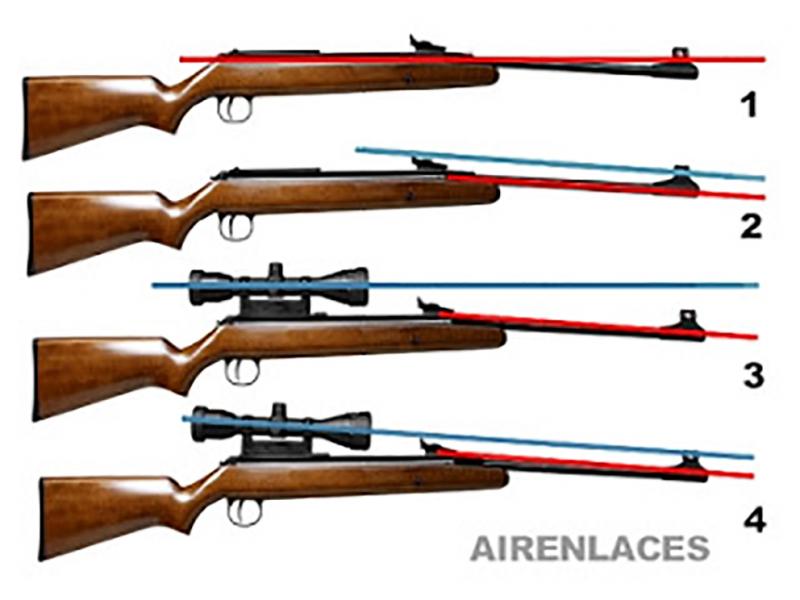 Cuando faltan clicks en altura, eso, para nada quiere decir que el visor sea malo, o este mal, no nos confundamos. Eso, es que el visor y cañon, no están en la misma línea, por culpa de unas monturas corrientes, o incluso, por el Drop Barrell, como las carabinas Diana, y otras marcas, que el cañon, esta ligeramente hacia abajo. Fijate, en el dibujo 3, es el clásico problema, de quedarse sin clicks en altura en el visor......y como se corrige en el dibujo 4......
