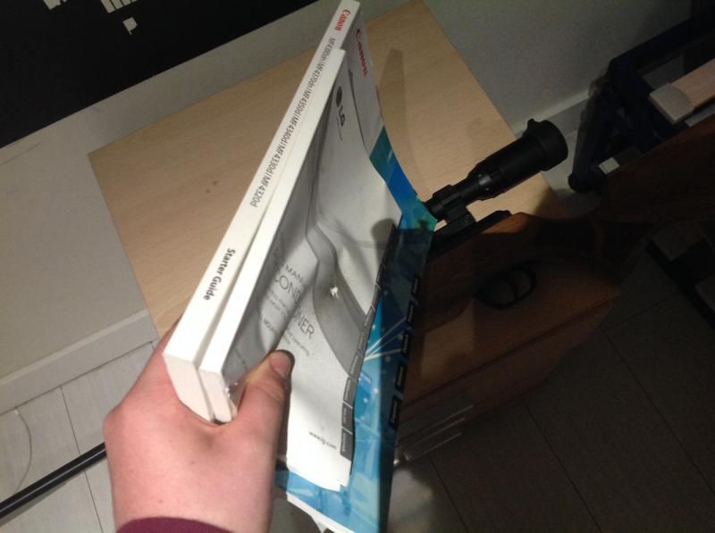 Mi primera impresión? La cometa premier parece más clara en fotografías de lo que es, pero me ha encantado, acabados perfectos se la ve robusta y eficaz. Como no viene engrasadisima. Lo primero que he hecho es limpiarla examinarla y montar el visor. Solo he realizado un disparo de prueba. Las sensaciones han sido impresionantes para que engañarnos. Bastante ruidosa, dentro de lo normal, gatillo agradable para ser de resorte y potencia brutal. He colocado dos guías, la segunda la he puesto de seguridad "extra" por si acaso. Cargo la cometa y disparo a bocajarro. Me acerco y veo que ha pasado la primera guía como mantequilla, y ha atravesado unas 100 páginas de la segunda. Impresionante. Al recuperar el balón me ha resultado agradable ver que se ha deformado bastante. En definitiva estoy contentísimo con mi compra. Espero poder hacer las primeras pruebas a 20 metros la semana que viene y poder contar cómo van los nuevos cañones cometa del 6,35 ya que nadie habla de ellos. Tenemos buenas referencias del 5.5 pero no del 6,35 así que espero poder romper una lanza a favor de este calibre. Volver a remarcar el exceso de aceite en el interior del cañón y mecanismos. Al realizar el disparo salió una nube de aceite como si de humo se tratara. Puso la guía perdida. Les adjunto unas imágenes de la carabina y el visor, las guías y la deformación. Espero poder completar el post la semana que viene con las primeras impresiones a la hora de la verdad. Espero que les sirva de ayuda! :shoot-soldier: :rambo: