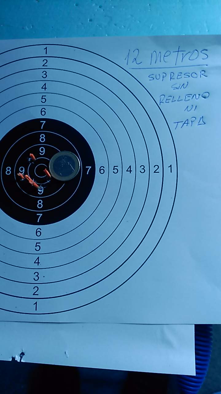 Otros 5 disparos a 12 metros con el cometa heavy, pero esta vez con el silenciador vaciado (sin el relleno) y si la tapa de cierre ( por si rebotaba el balin), Y LO MISMO. Los impactos dan igual que con el silenciador completo "bajos".
