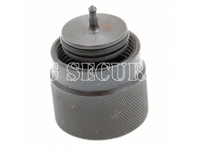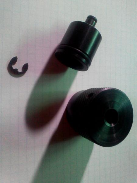El tapón tiene dos piezas: una es una especie de tuerca loca que es la que rosca, empuja al verdadero tapón e impide que se salga manteniéndolo en su lugar, lleva el moleteado y el agujero para la barrita que ayuda a aflojarla y a apretarla; la otra es el verdadero tapón que se introduce en la cámara que aloja la botella de 12 g, este tiene una tórica que es la que hace la estanqueidad, un extremo del tapón pincha el precinto de la botella y el otro sobresale de la tuerca loca para llevar el clip de sujección.