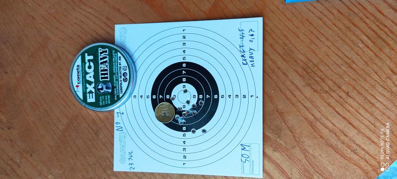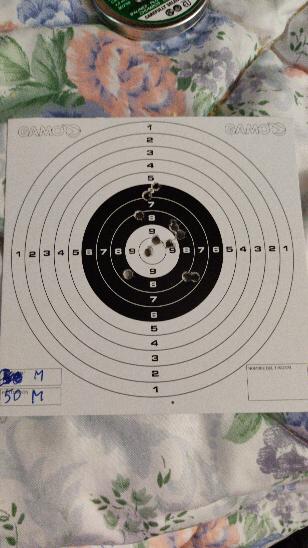 os pongo una foto de una diana a 20 metros que es lo maximo que puedo tirar en casa 5 disparos en cada agrupación menos en el centro que ai 10 disparos las sensaciones son muy buenas