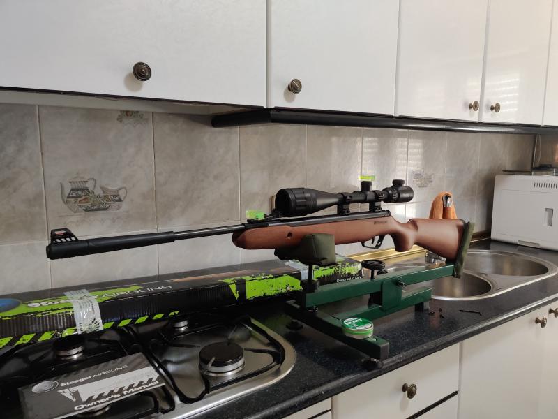 Sobre ese banco de tiro...yo probaría a tirar solamente con un saco de tiro relleno de arroz por ejemplo, y apoyando la culata en el hombro.