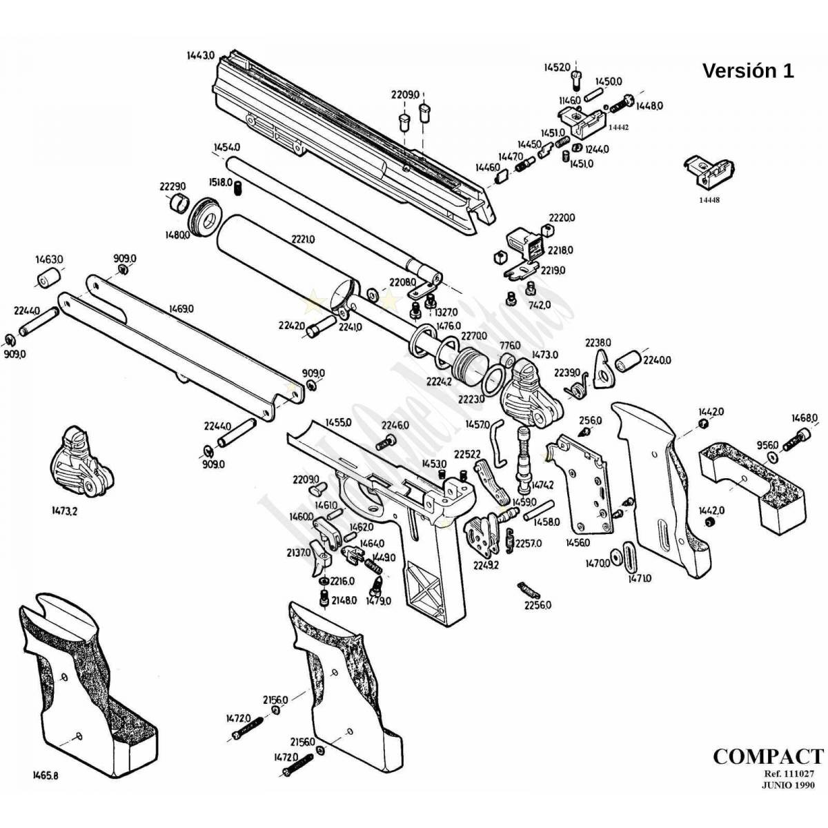 Los despieces de las dos versiones se diferencian sólo en los sellos del pistón de compresión. En la versión 1 es una tórica de goma, en la 2 es una pieza diferente, similar al sello de los pistones de resorteras.