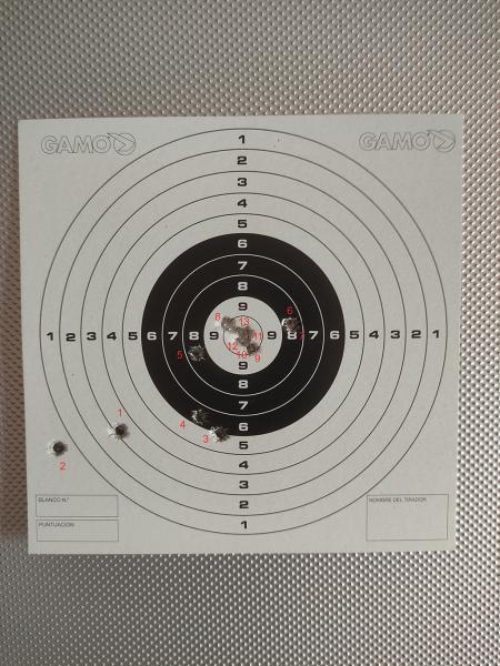 Como dije que iba a hacer en mi anterior mensaje, comparto con vosotros una diana que he hecho esta tarde para centrar el visor. La distancia a la diana es de 25 metros, lo máximo que me puedo permitir.