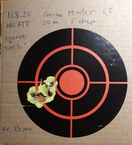 Como el verano es cuando dedico más tiempo al aire comprimido, estoy tirando con mi Gamo Hunter 440, en calibre 5,5, a 20 m con visor, con resultados, digamos, mejorables. Sé que es un arma diseñada para la caza de pequeños animales (disclaimer: allá donde sea legal) y el lateo, y ahí cumpliría de sobra, pero quiero ver hasta donde llega en precisión.