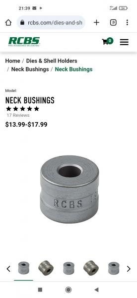 Creo que hay política en esta web a la hora de colgar ciertas cosas, así que para evitar lios te adjunto foto de la página original de RCBS de lo que comentábamos, son los bushing que se colocan en los dies para recalibrar el cuello de las vainas, pero hay en muchos diámetros incluídos el .214, .215,, .216, etc.