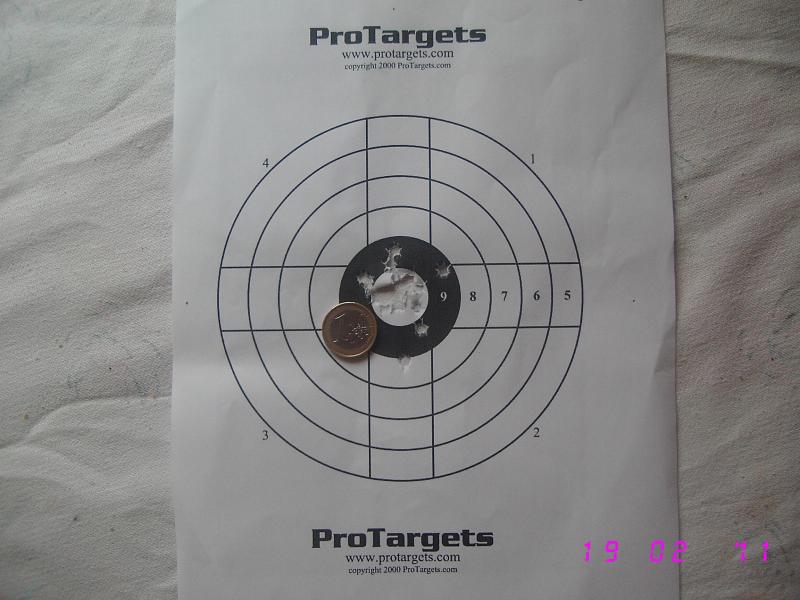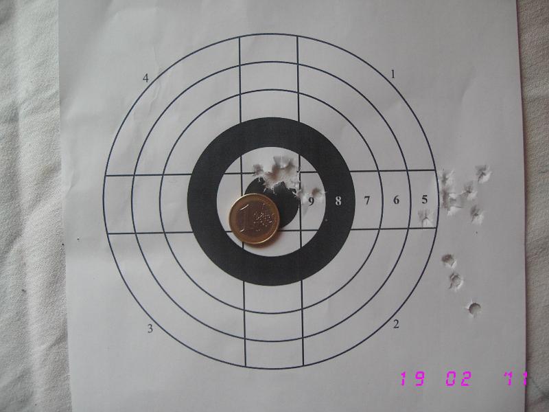 A falta de buen tiempo y tras conseguir acceso a un local cubierto he probado dianas, tras centrar por fin correctamente el visor, y puedo asegurar que, al menos a 11 mt, el bicho es completamente monoagujero. Pero completamente. Sabía los disparos que había en cada blanco por que los contaba al dispararlos si no es imposible, ya que no abría la agrupación mas de 6 o 7 milímetros.