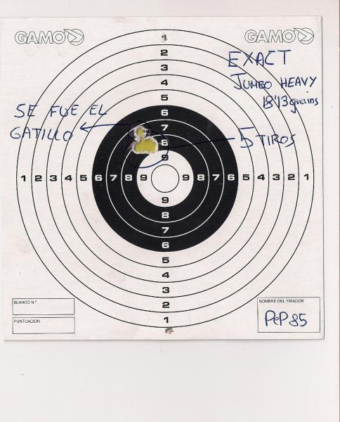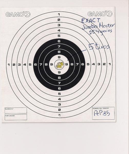 Hola hoy en casa e probado haber como se portaba mi turca con los siguientes balines: cometa exact jumbo heavy 18.15grains, cometa exact jumbo moster 25.4grains y H&N baracuda match 21.3 grains. La distancia que disponia en casa para hacer la prueba era 25metros,el visor gamo 4x16x50, punto apoyo dos sillas una para sentarme y otra para apollar la carabina (sobre el respaldo la silla). Potencia regulada: pues no se la aguja fina y a tope rosca(fullpower), el resultado creo que es bueno ja que con un apollo mejor y un visor de mas aumentos se podria mejorar algo, que opinais va mal,bien,muy bien, o lo normal en las at44? fotos a 25m: