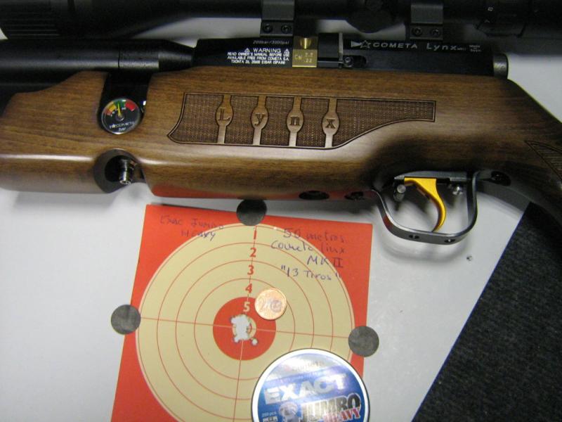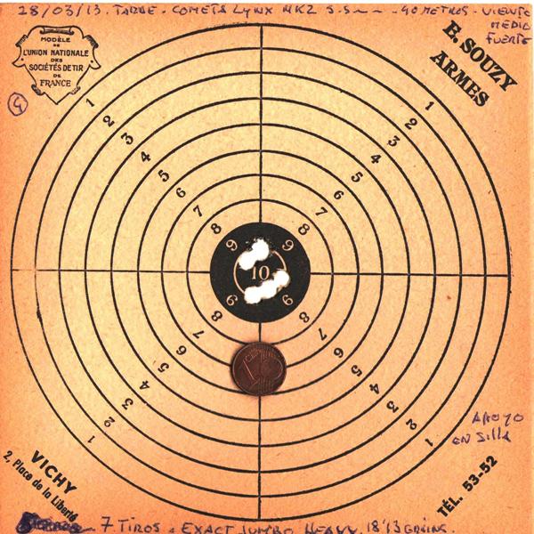 Os dejo unas fotos de la nueva Lynx y unas agrupaciones,es mucho mejor en varios aspectos que la anterior;mas fina de mecanismos,precisa,potente,mejor acabada,palanca sin apenas juego y muy fina,regulador 110B,el gatillo es de mucha mejor calidad y mucho mas previsible.Ya os dareis cuenta en las fotos.En cuanto a la armeria donde la compre y probe,en su galeria subterranea,es de lo mejorcito,tienen de todo y a muy buen precio.Vale la pena chuparse unos kilometros y asi probar lo que vas a comprar antes,recomiendo esta armeria que me hizo conocer Jose Blanco :apla: la cometa y yo en la galeria de tiro de la fantastica armeria de los Hermanos censurada por spam en Almansa.Saludos!
