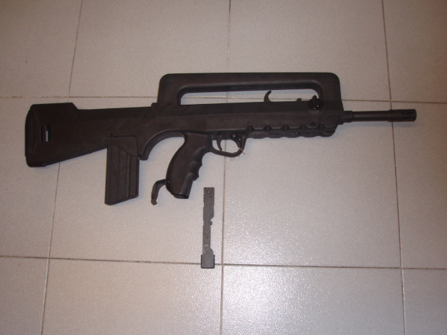Se trata de una rèplica a escala 1/1 del actual fusil de asalto de las FFAA Francesas, el fusil FAMAS accionado por C02 y en calibre 4,5, utilizando esclusivamente munición del tipo Diabolo. Ya se que hoy dia se encuentran réplicas de airsoft, pero cuando este se fabricó, eso no existía. Estoy hablando de principio de los 80.