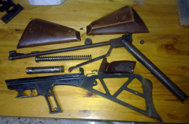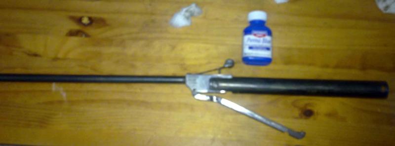 Ahora viene la hora del pavón frio, tras limpiar bien las partes a tratar, tras varias pasadas, consigo un pavonado imitando a viejo, no queda totalmente negro, pues el pavonado queda como haciendo ondas claras y mas oscuras, al verlo, prefiero dejarlo así y no dar mas capas pues da un aire a antiguo que es lo que busco, ahora pintado de la parte del gatillo, limpieza de las partes de plástico (empuñadura y culata), le instalo una guia de muelles más pequeña y le pongo un muelle de 30 vueltas (el original es de 27),cambio el sello y la junta tórica del cañón, y a empezar a su armado. El resultado es este, funcionando ahora a la perfección su disparo es fuerte y seco, no lo he pasado por el crony, pero no es lo que mas me importa, lo bueno de esta carabina es su asombrosa precisión a 20 mts. y esta ha vuelto a nacer.