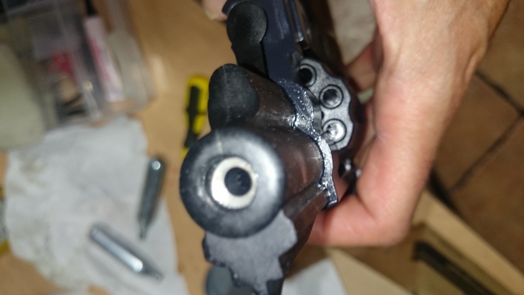 HAce un par de días compré un R77 corto ( por cierto, buen vendedor CHARLIEPLASTC , todo correcto . Muy recomendable) y no agrupaba ni pa'trás. Sospechando de que los balines entrasen mordidos en el cañón desde que son impulsado en el tambor, simplemente he sacado el cañón y le he hecho un bisel, pues viene en canto vivo. Además, como el cañón en su salida quedaba muy pegado al plástico que simula el cañón real, le he metido una broca de 8mm, con lo que le he comido el plástico y de regalo le he hecho una corona. En ambos casos, he pulido con la dremmel para eliminar rebabas. Luego engrase y limpieza, que el pobre era de 1996.