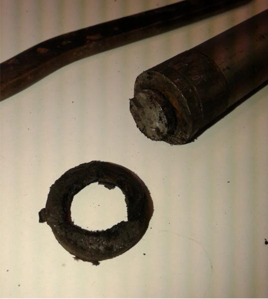 Según puedo ver,y además supongo también,lo que te ha pasado es que el pistón por el desgaste del sello ha golpeado contra el final de la cámara y se ha remachado la tuerca que comprime el sello.Esta tuerca debería salir,va a rosca y en la mía también tenía dos punzonadas para digamos no se desenroscase,de todas formas tendrás que quitarla,encuentres el sello original u otro...repito,por lo menos es lo que aprecio.