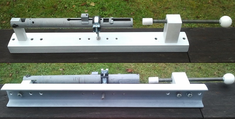 De todas formas es mejorable. La varilla roscada que sujeta la abrazadera se podría doblar para los lados al apretar el muelle. Debería sustituirse por un bloque sólido como los de los extremos, aunque sea en madera bien gruesa.
