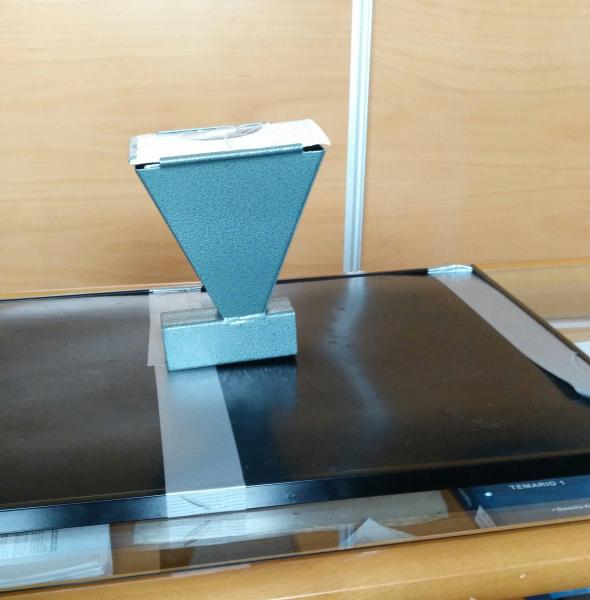 En un simple marco de cuadro con dos recortes de suelo de goma, ambas cosas compradas en leroy merlin, los suelos te los cortan por metros pero con la anchura del rollo así que sobra bastante pero bueno para más cosas servirá, la cinta "americana" es porque lleva dos capas de suelo ya que una la atraviesa y el marco no tiene grosor suficiente para contenerlas, con un marco más ancho quedaría perfecto sin necesidad de los pegotes. Mirar en la trasera los impactos